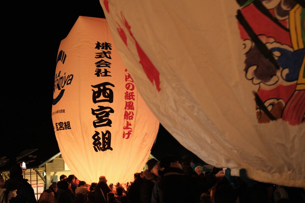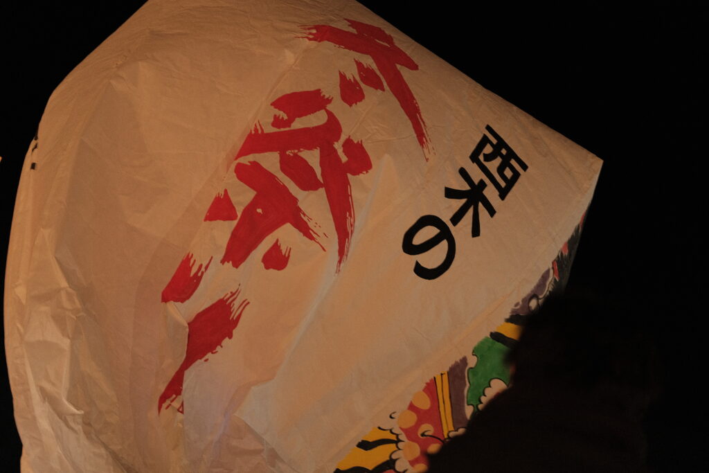 ・昨夏の大雨を乗り越え、仙北市上桧木内地区で願い込めた紙風船が夜空へ舞い上がる。
