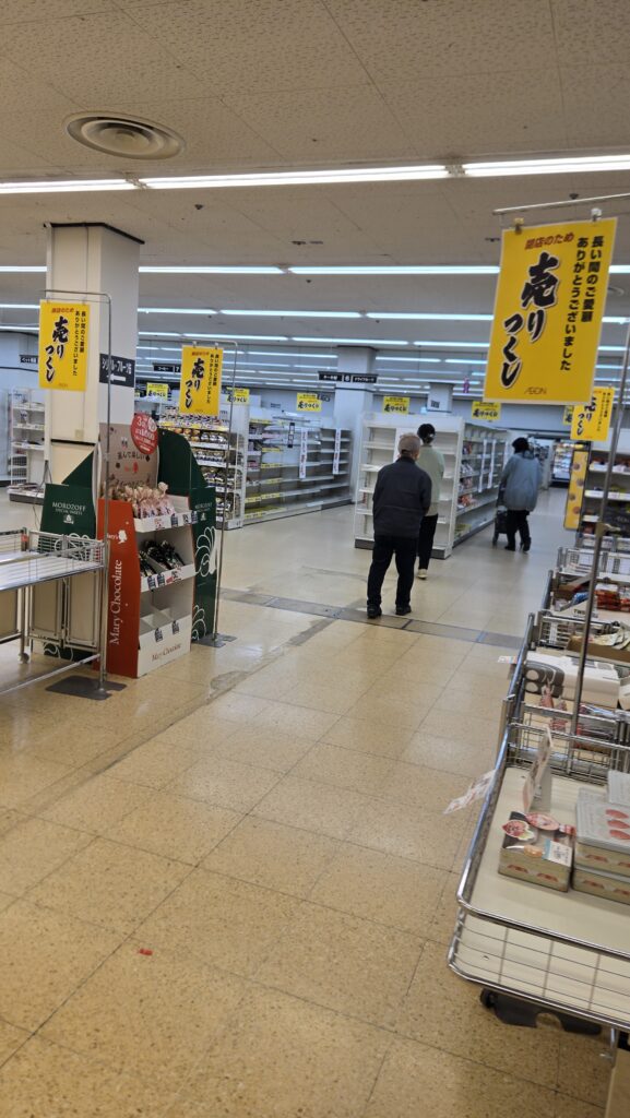 来年2月末で閉店のイオン土崎港店で売り尽くしセール “崎ジャス”のさまざまな思い出胸に…来店客が買い物楽しむ 秋田市(2025年12月11日掲載)|ABS NEWS NNN 閉店・倒産 2026.02.28 ・来年2月末でイオン土崎港店が閉店予定。・閉店前に売り尽くしセールを実施、地元客が思い出とともに買い物を楽しむ。・記事は秋田市の地域コミュニティへの影響や顧客の感情を紹介。 出典元:詳細はこちら いよいよ土崎のイオンが閉店。たくさんの人が訪れていた。 店内は売り尽くしセール うーん、寂しい。。。